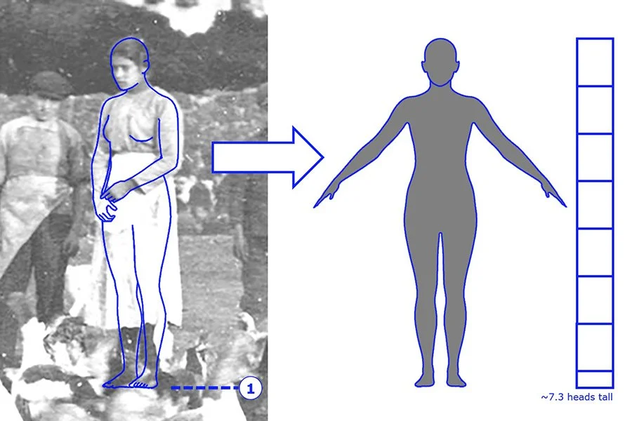 Unfortunately, this interpretation, while clever, is not tenable. In addition to violating Occam’s Razor, it is at odds with the proportionality of those parts of Figure 4’s body that are clearly articulated. Starting with the head, we artists know the rule of thumb that women’s height from puberty through adulthood averages between 7 and 7.5 times the height of the head. My analysis below shows that Figure 4 falls squarely within this range, with limbs well-proportioned for a teenage female, if she is standing at Elevation 1...