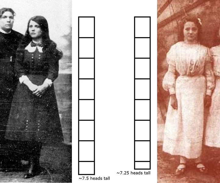 Photographs of Teresa Goretti (b. 1900, left) and Ersilia Goretti (b. 1898, right), taken in ca. 1909-1910, exhibit normal proportions.