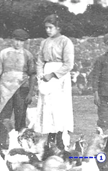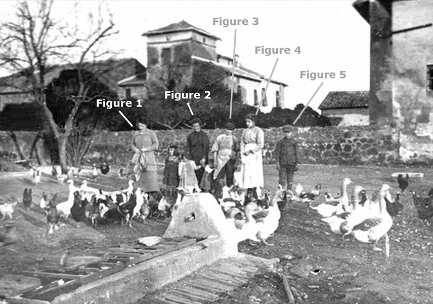 Now, in comparing Figure 4 to the other individuals in the photograph, including the teenage boy at her side, the impression given is of a tall, robust young woman. This impression is strong enough to withstand any uncertain perspectival effects caused by vagaries in the lay of the land, etc. De Angelis recognized the difficulty but explained it away by positing that Figure 4 is standing on an upturned bucket obscured from view by the fowl and is thus much shorter than it appears. In other words, although the eye’s most natural interpretation of the photograph is that Figure 4 is standing at the elevation level marked 1 (blue) in the image below...